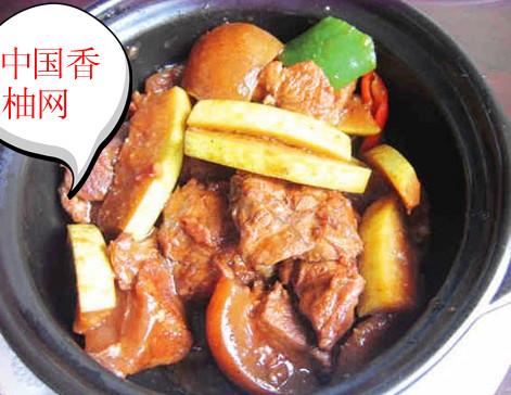 材料:牛黄仔400克,柚皮100克,青红椒、蒜苗、冬菇、柱侯酱等适量。